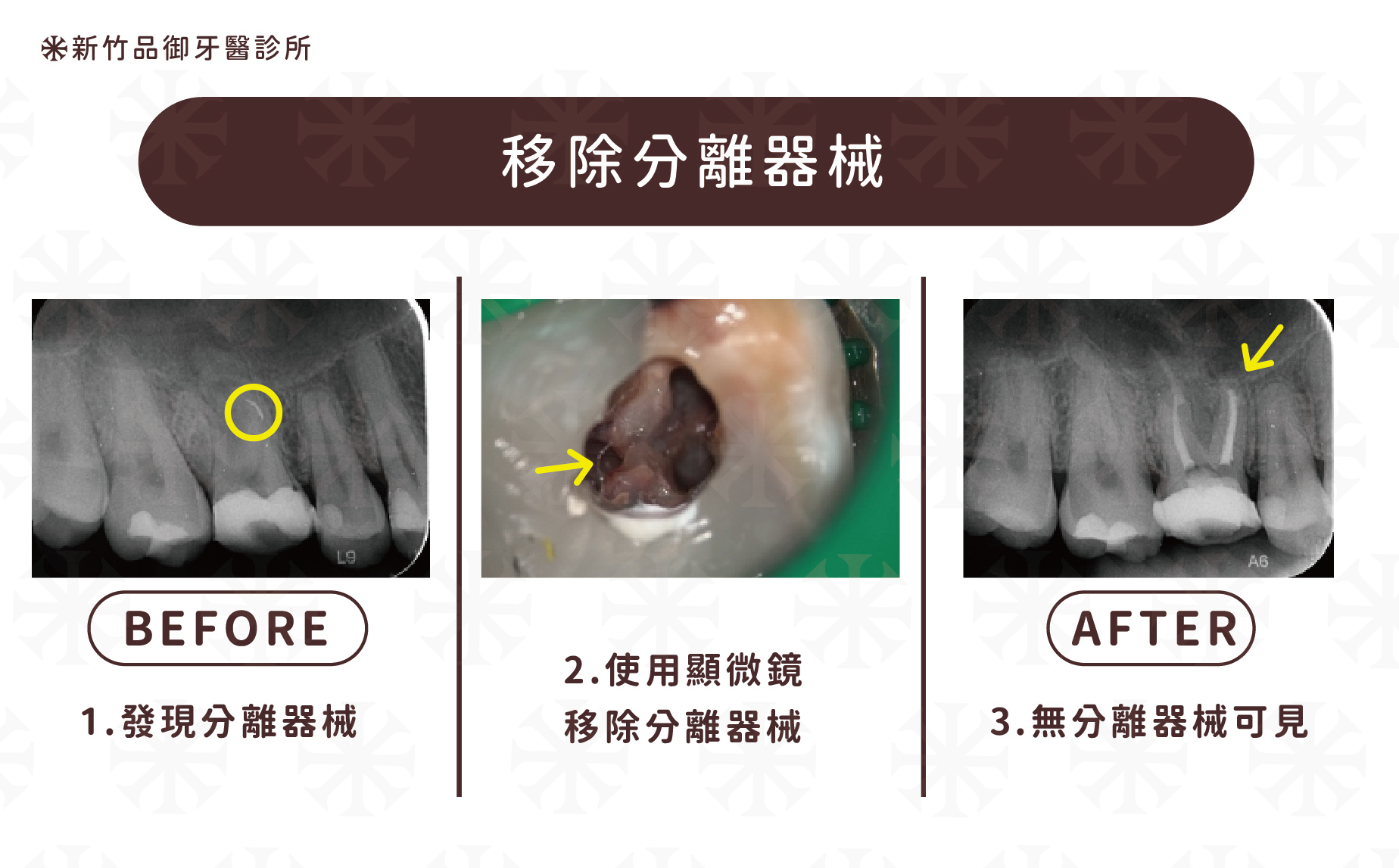 顯微鏡能清楚找到根管內的分離器械,進行移除,術後X光確認器械已無殘留。