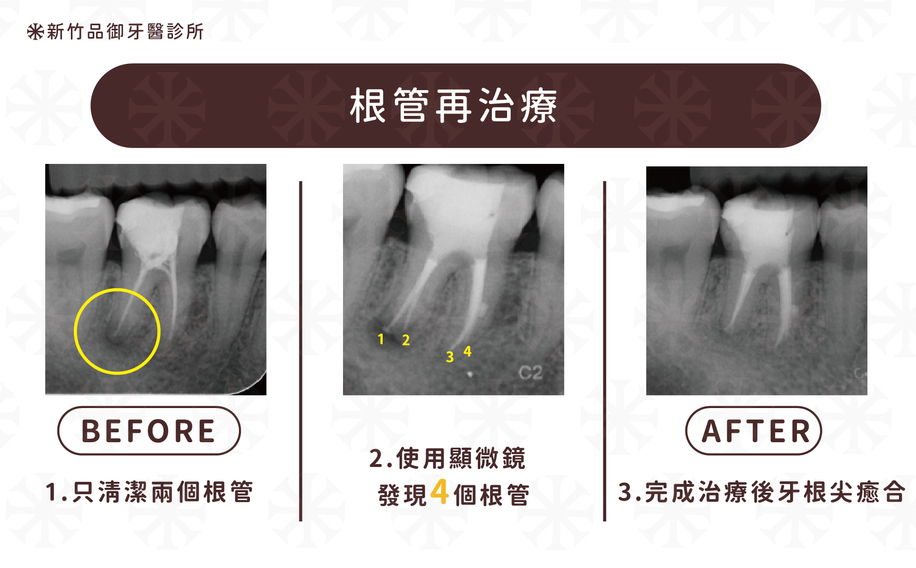 針對之前未完全清潔的根管,顯微根管治療能找出隱藏的神經管,徹底清創並治療發炎部位。