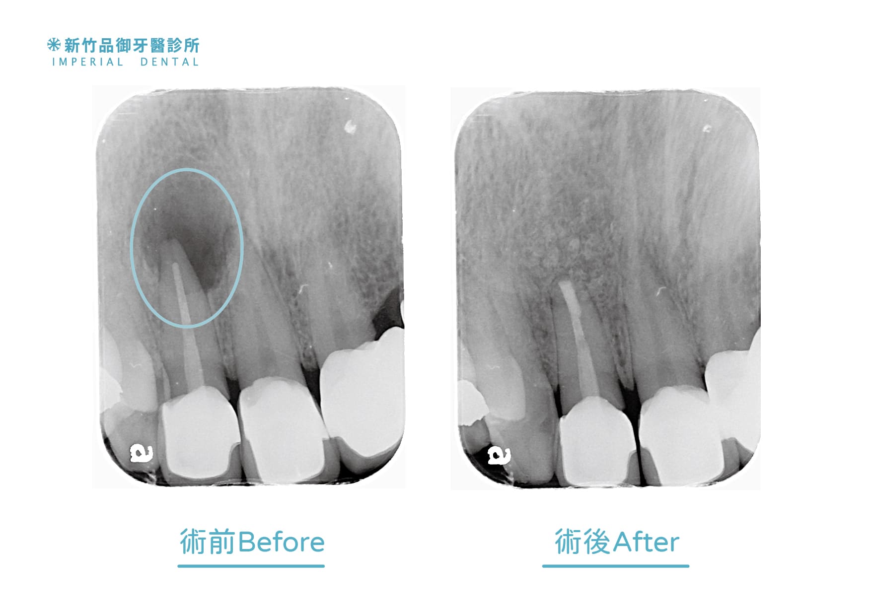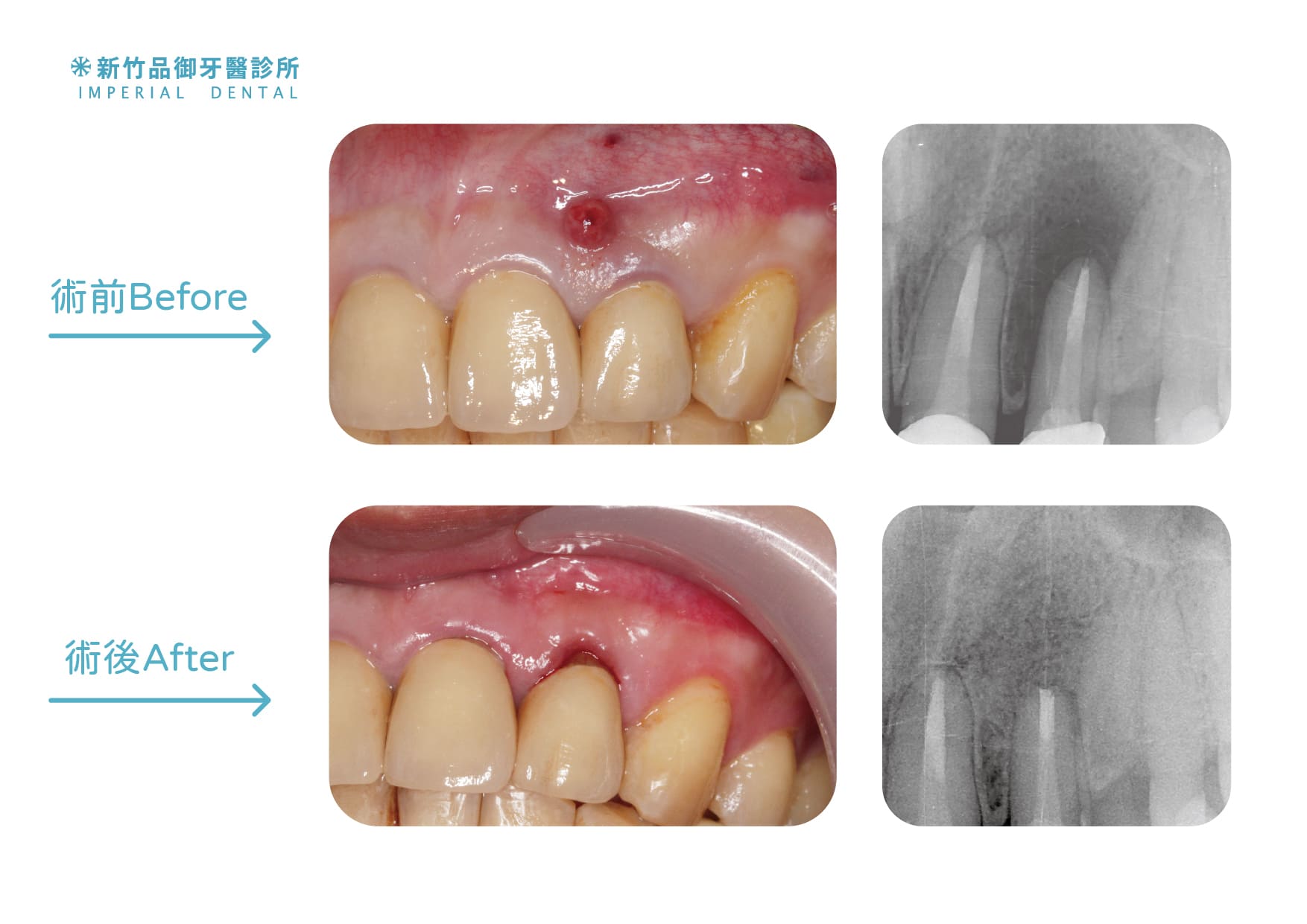 S 先生因為前面門牙腫痛及膿胞前來就診,檢查發現左上側門牙根尖發炎,因牙套密合度良好,故接受顯微根尖手術治療,術後膿胞消失且追蹤檢查發現病灶處骨質癒合完全。