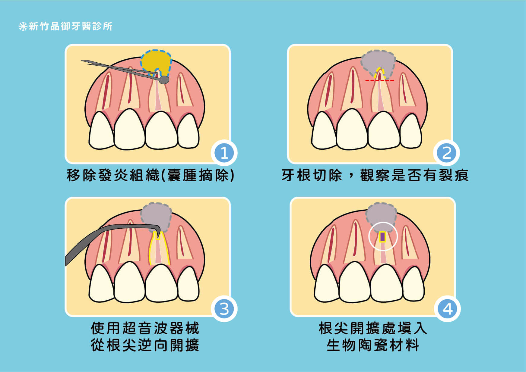 - 使用超音波對牙根進行逆向根管治療,使用與人體生物相容性好的生醫材料封填,必要時,手術當中可以同置放再生膜、膠原蛋白或人工骨粉,進行引導組織再生術(GTR),幫助病灶骨質恢復。