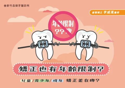 誰說矯正牙齒有年齡限制?不論年紀大小,只要牙齒和牙周健康狀況允許,矯正牙齒都是可行的選擇! 無論你是孩子還是成人,矯正牙齒不僅能讓你的笑容更迷人,還能改善咀嚼和口腔健康。品御將破除矯正的年齡迷思,從專業的角度告訴你,不管你多大,都別錯過矯正的最佳時機,展現自信笑容吧!